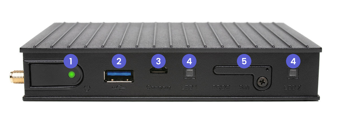 The power button allows the user to turn the device on and off. The power indicator LED notifies the user that the device is operational and the compute module is working.