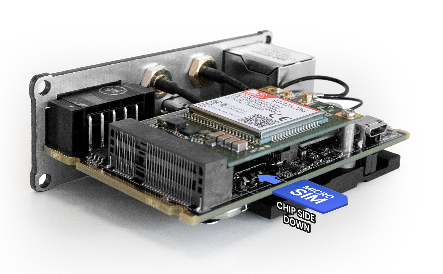 Orientation: Insert the SIM card with the metal contacts facing the PCB (downwards) and the corner cut facing the backplate of the gateway (towards the outside).